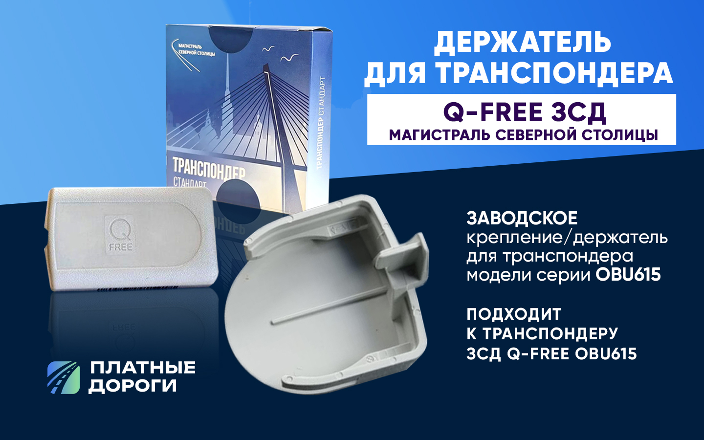 Держатель для транспондера ЗСД СПБ Q-Free OBU615 Заводской держатель для транспондера Магистраль Северной Столицы ,OBU615S/OBU615L DSRC с точно таким же держателем поставляются заводские транспондеры Западный Скоростной Диаметр OBU615. Для корректной работы транспондера платные дороги устройство необходимо установить на ветровое стекло транспортного средства. В этом вам поможет специальный держатель для транспондера. Держатель для транспондера выполнен в белом нейтральном цвете и имеет клейкую сторону, благодаря которой устройство надежно крепится на лобовом стекле. Дополнительный держатель будет особенно полезен тем, кто планирует использовать один транспондер на нескольких автомобилях. Устройство держателя позволяет переставлять транспондер из одного транспортного средства в другое и правильно закреплять его в каждом из автомобилей.